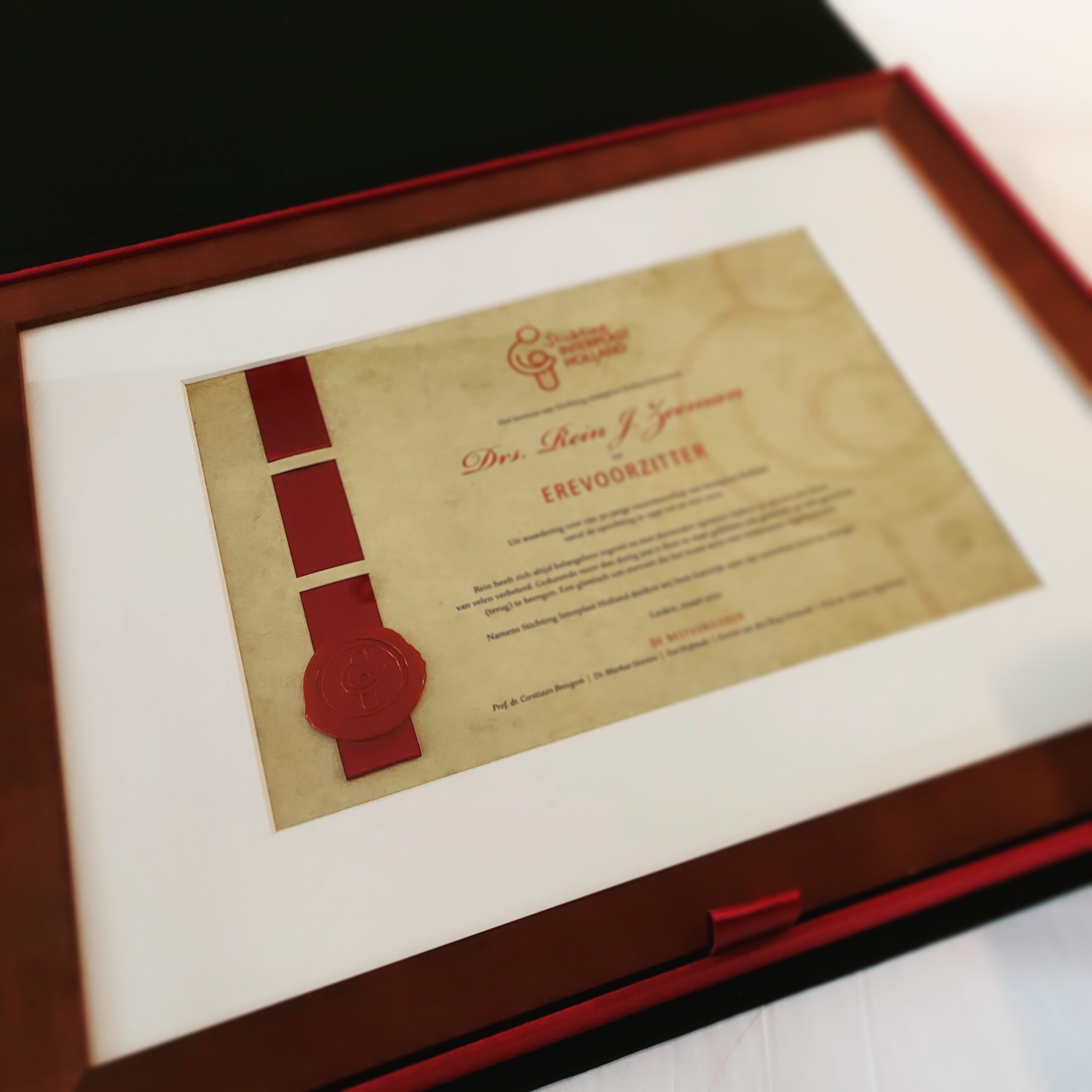 Oorkondes worden geprint op 300 gr fine art paper. Dat is een offwhite papier met een lichte structuur. De oorkonde kan worden voorzien van een satijnlint en een lakzegel en worden ingelijst in een houten of aluminium lijst. Bekijk hier de mogelijkheden. Alle gegevens, zoals bijvoorbeeld naam, prestatie, handtekening en logo, kunnen in het ontwerp worden geïntegreerd.